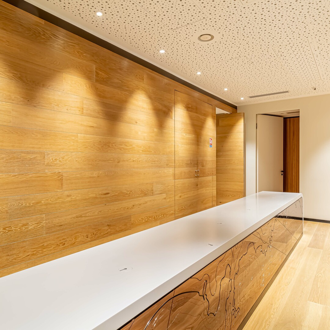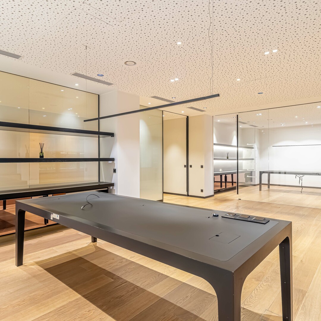 One of the two upper units is dedicated to management, with a circular hall with plenty of storage leading to an elegant secretaries' reception, a spacious executive office, a private kitchenette, a bathroom and even a gym. This unit communicates with the lower floor, which is set up as a large open space, with a secretarial area equipped with office equipment such as photocopiers, a kitchen, changing rooms and toilets for men and women, as well as several closed rooms that can be used as offices or conference rooms.