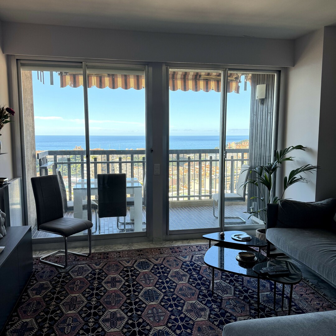 A pochi passi da tutti i servizi e nel centro di Monaco , luminoso appartamento ad un piano elevato composto da un soggiorno con terrazza panoramica , una cucina equipaggiata , due camere da letto entrambe con balcone, la prima camera con vista mare e città, la seconda con vista montagna, un bagno completo e una toilette per gli ospiti.