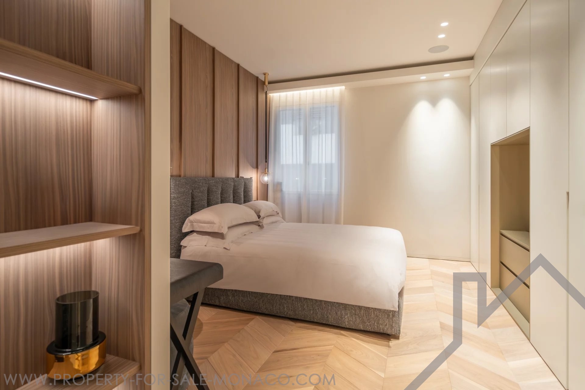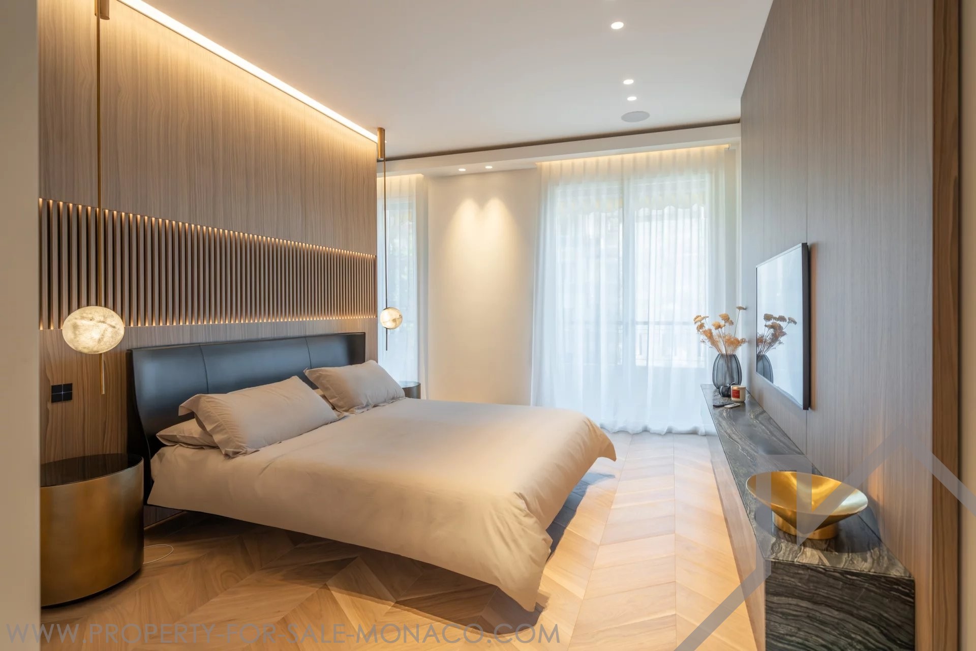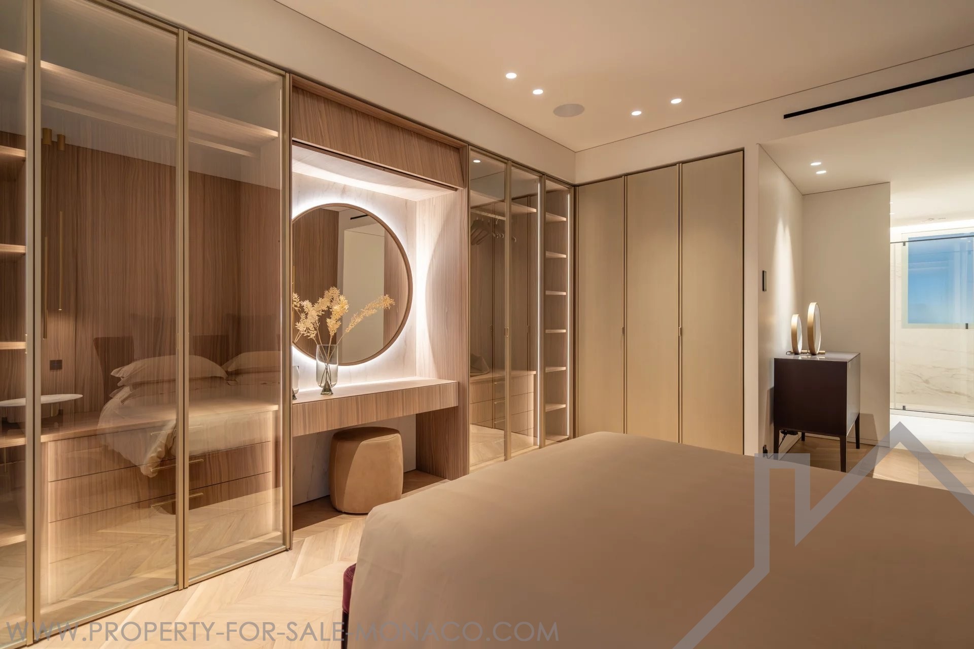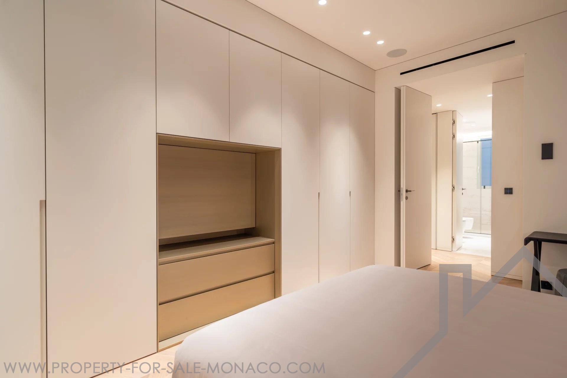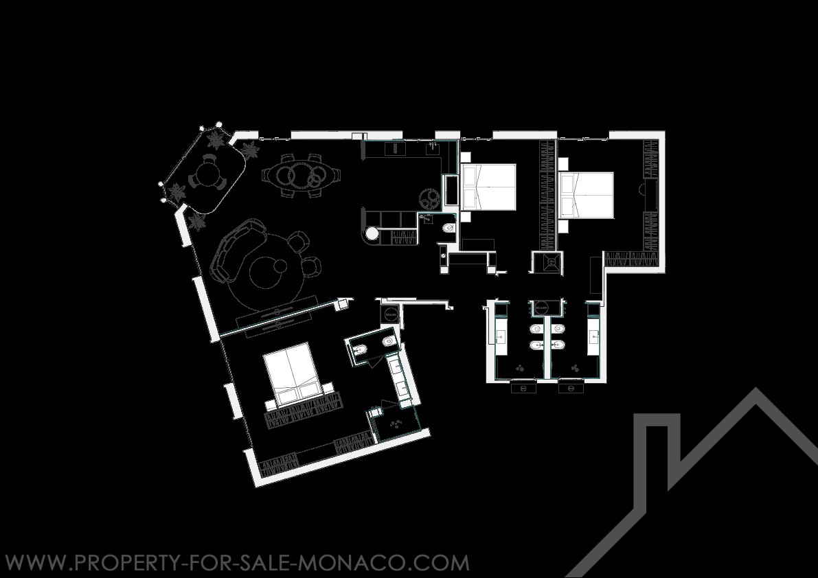 È composto da un ingresso, un luminoso soggiorno che si apre su un balcone con una piacevole vista sul Casinò e sui suoi giardini, una cucina semi-aperta e completamente attrezzata, una camera da letto principale con un ampio spogliatoio e un bagno con doccia completo, e due camere da letto, ognuna con il proprio spogliatoio e bagno con doccia.