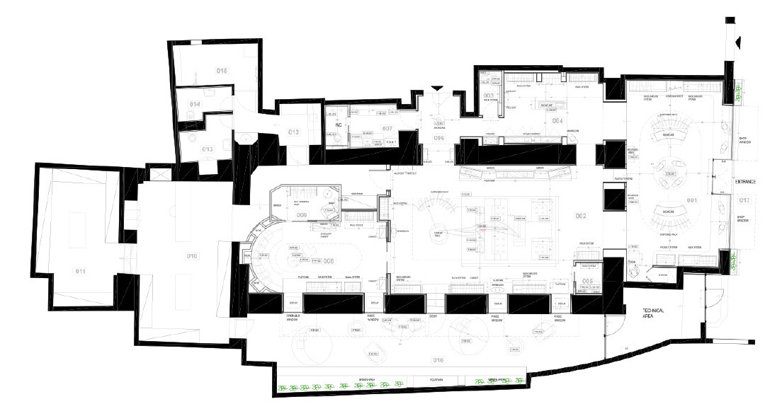 - un ingresso, un ampio salone, una sala VIP, un piccolo salone con camerino, 1 toilette, una toilette per uomini e donne, una zona cucina, un ufficio, un'officina, un ripostiglio e una terrazza privata