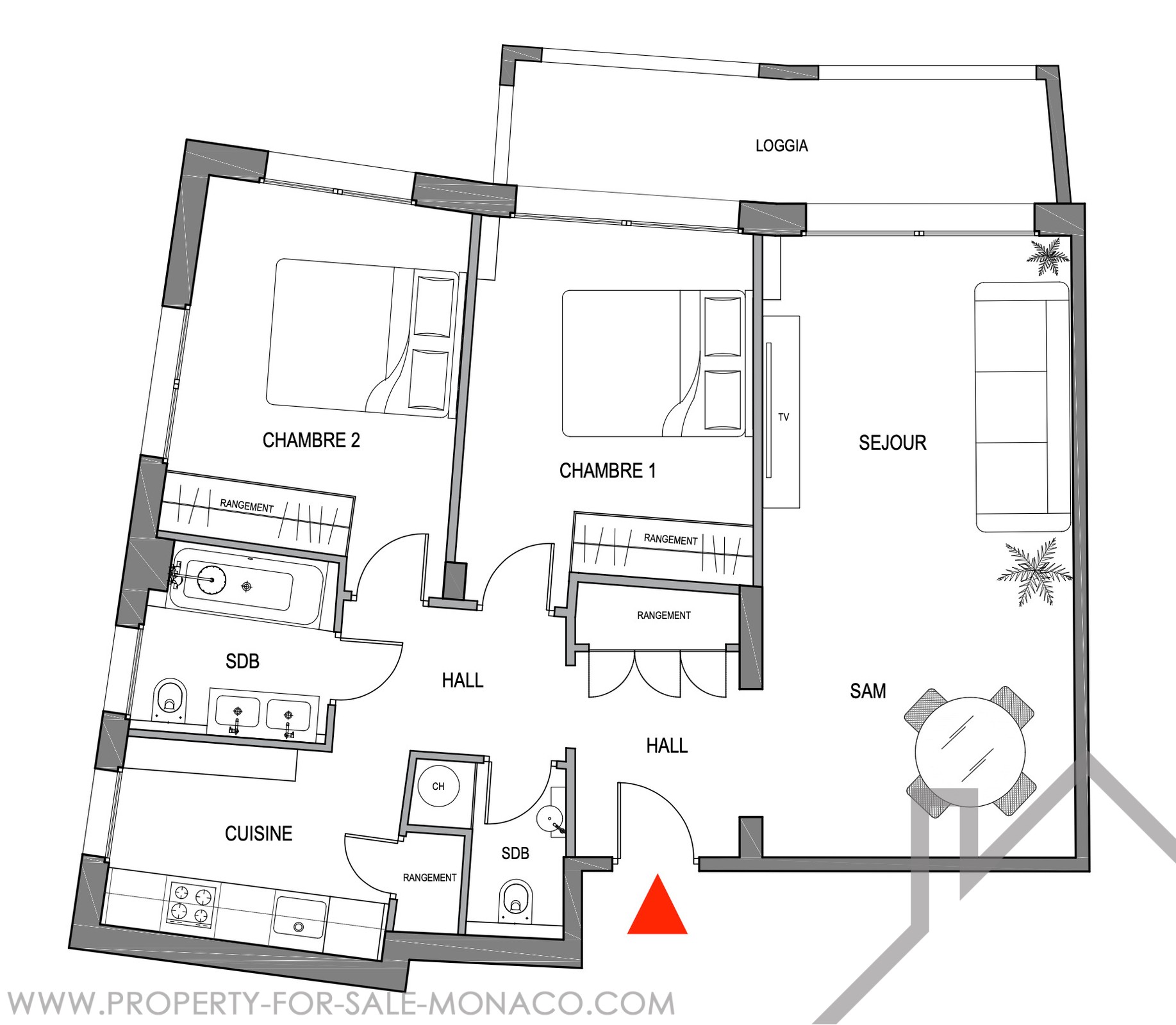 Ingresso, soggiorno, due camere da letto, corridoio, cucina equipaggiata, bagno, servizi ospiti, armadi a muro, aria condizionata, loggia
