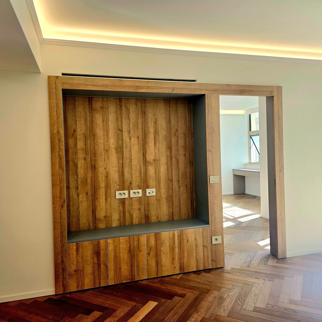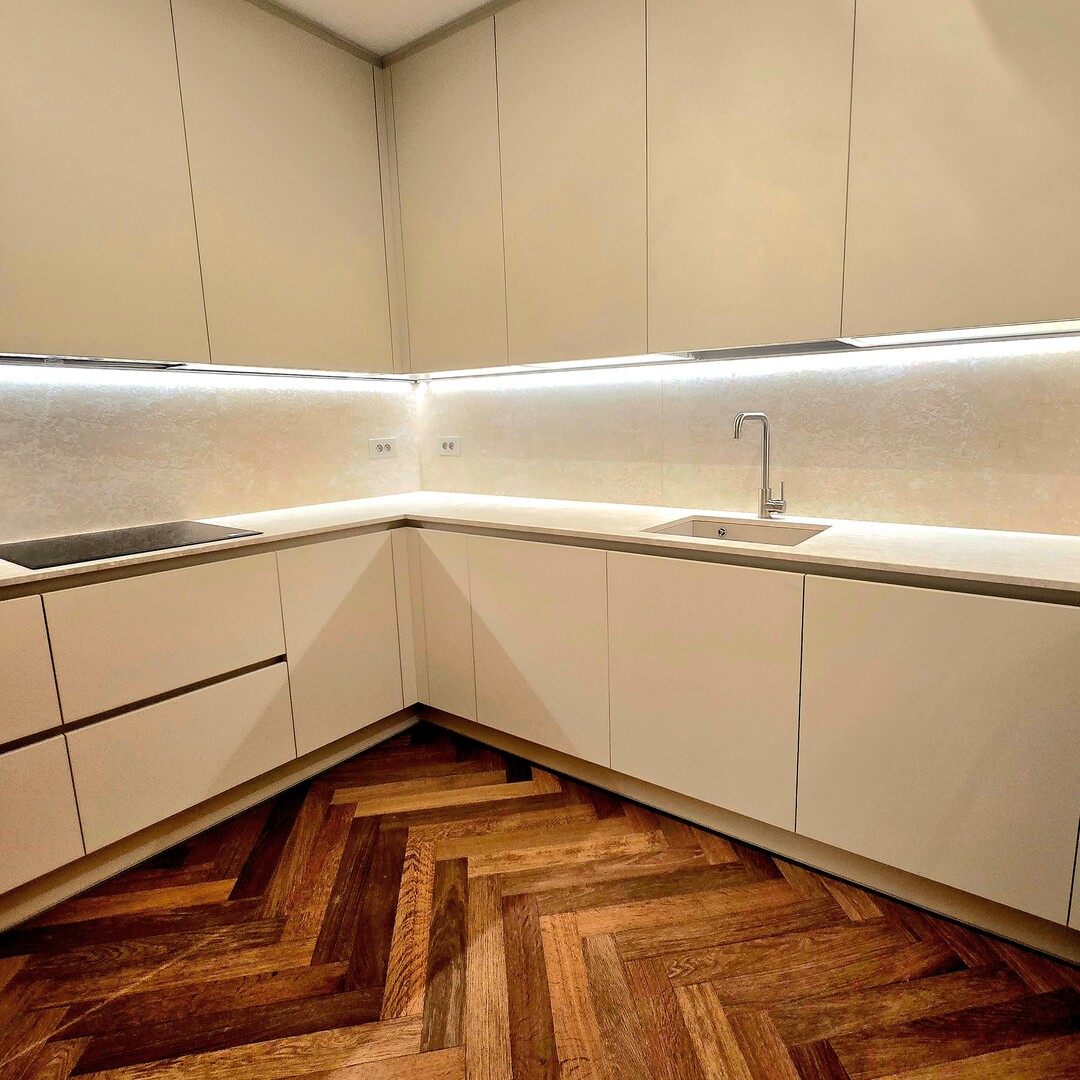 Si compone di due camere da letto con bagno privato, tra cui una camera da letto principale con spogliatoio attrezzato, una cucina separata completamente attrezzata e un bagno per gli ospiti. I materiali sono di alta qualità, il pavimento in parquet dona un tocco caldo e contemporaneo e i numerosi spazi di archiviazione ottimizzano lo spazio abitativo.