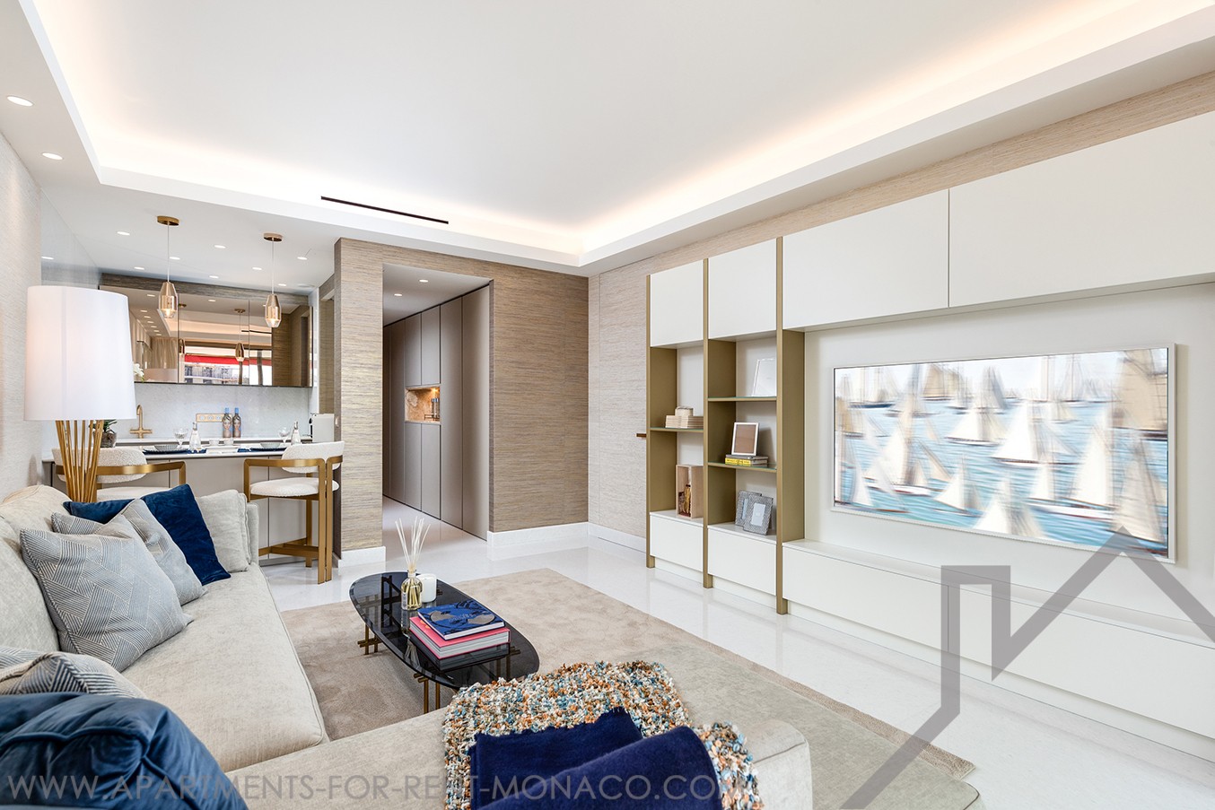 Il pavimento in marmo aggiunge un tocco di classe all'appartamento. La cucina a vista completamente attrezzata presenta un piano di lavoro in marmo bianco e un tavolo da pranzo con tocchi d'oro.