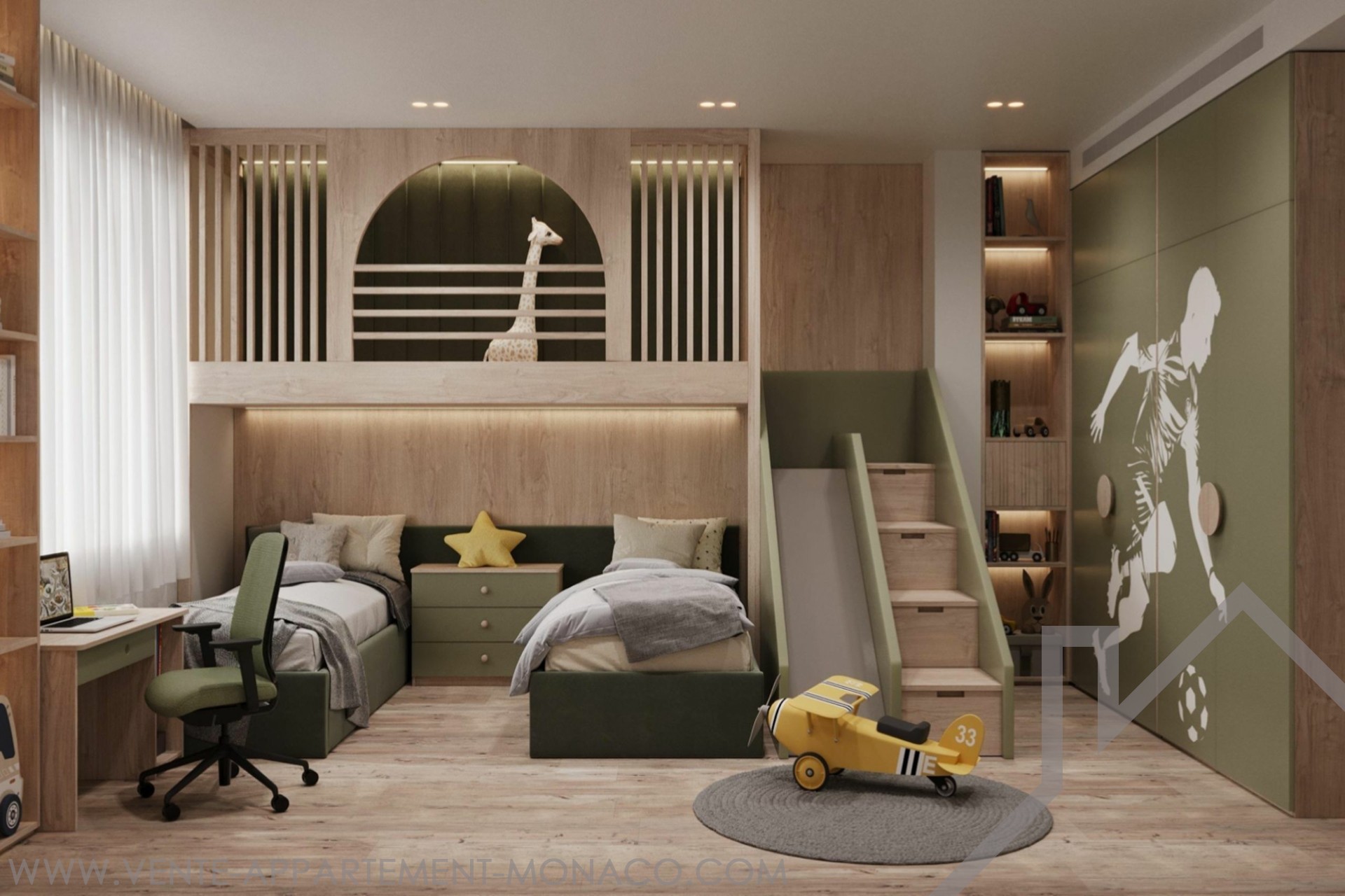 L'appartamento dispone di due camere da letto principali con armadi, oltre a un locale aggiuntivo perfetto per due bambini, un bagno con doccia completo, un bagno, una lavanderia e un soggiorno con cucina americana attrezzata. Palazzo signorile con ascensore e servizio di portineria.