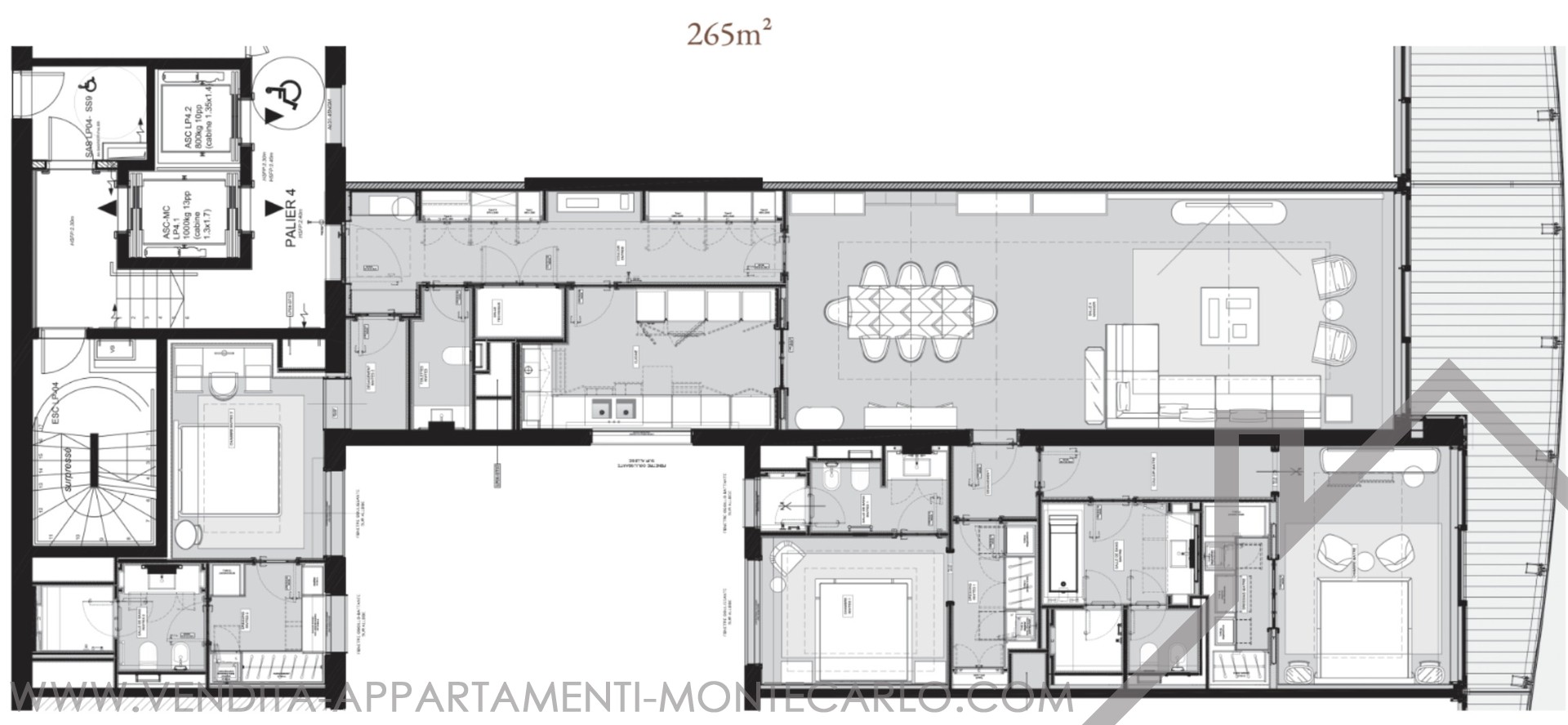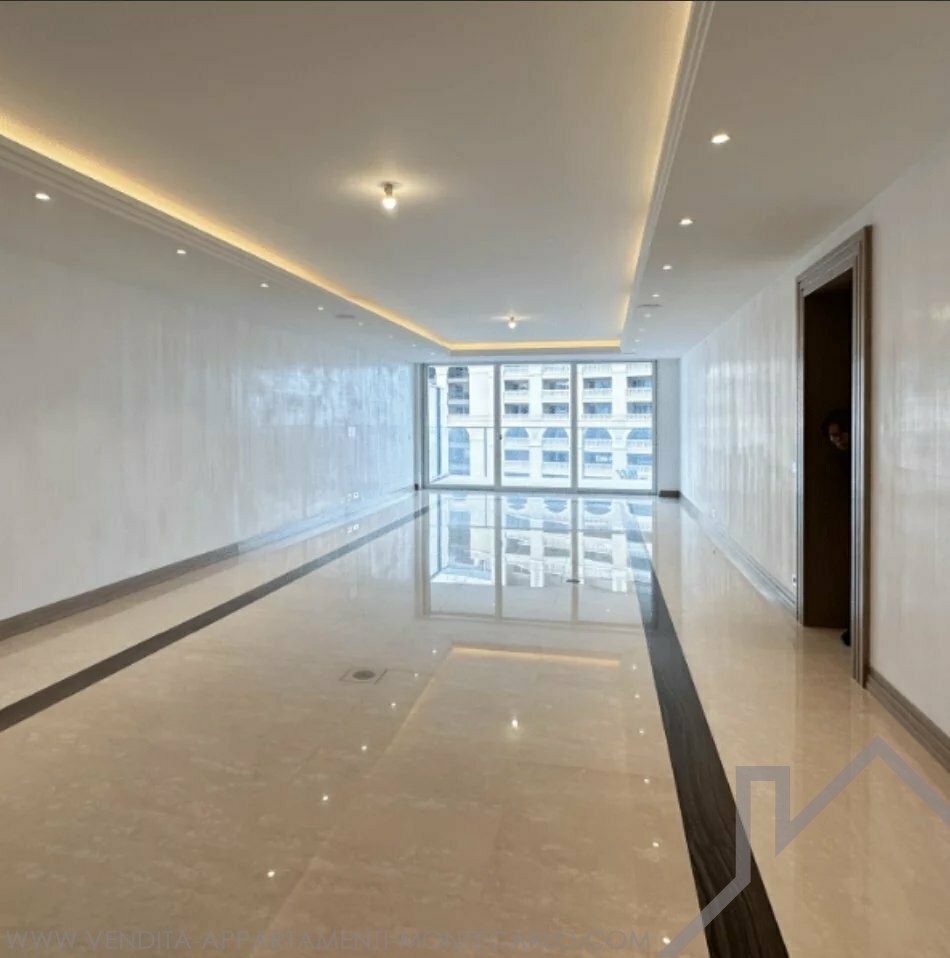 L'appartamento è composto da un ingresso, un soggiorno doppio, una bellissima cucina completamente attrezzata, tre ampie camere da letto, ciascuna con il proprio bagno, oltre a due camerini.