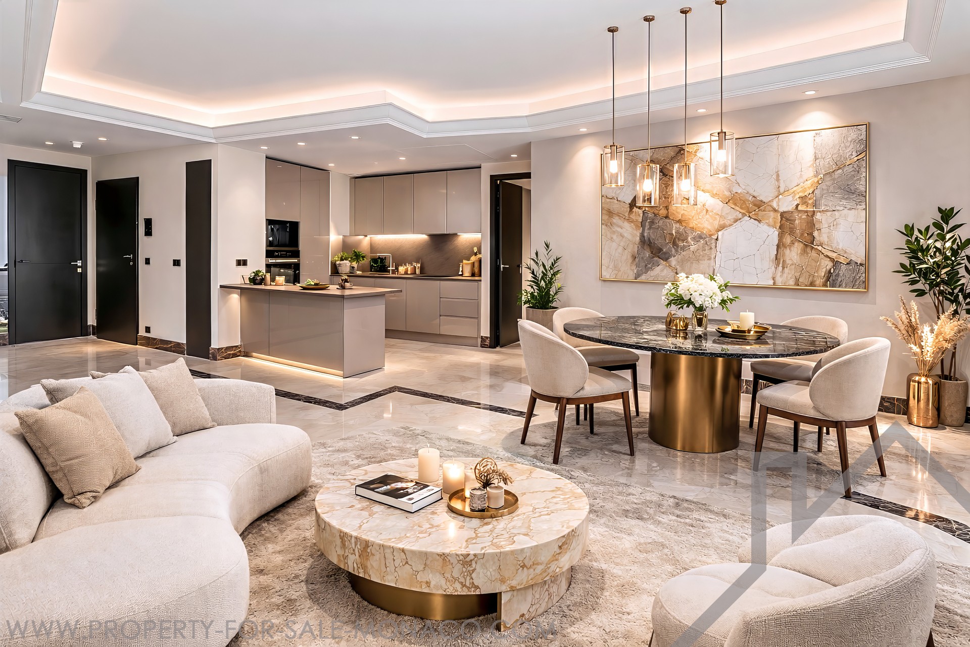 Finiture e dotazioni di alta gamma, rivestimenti in marmo (due finiture), parquet in legno pregiato nella camera da letto principale, cornici retroilluminate, stucchi murali, modanature decorative, testiera del letto modanata, mobili e infissi su misura.