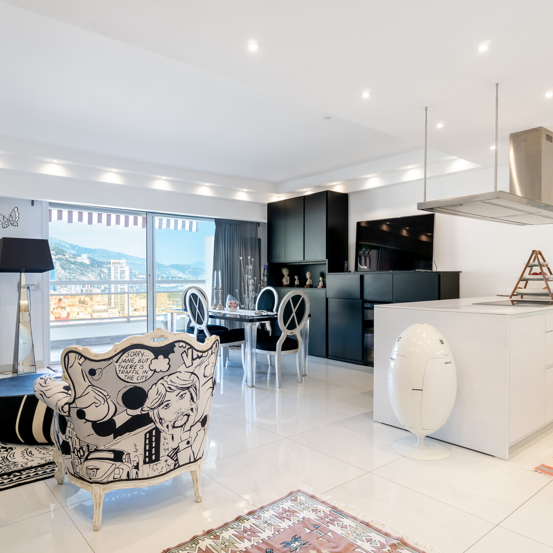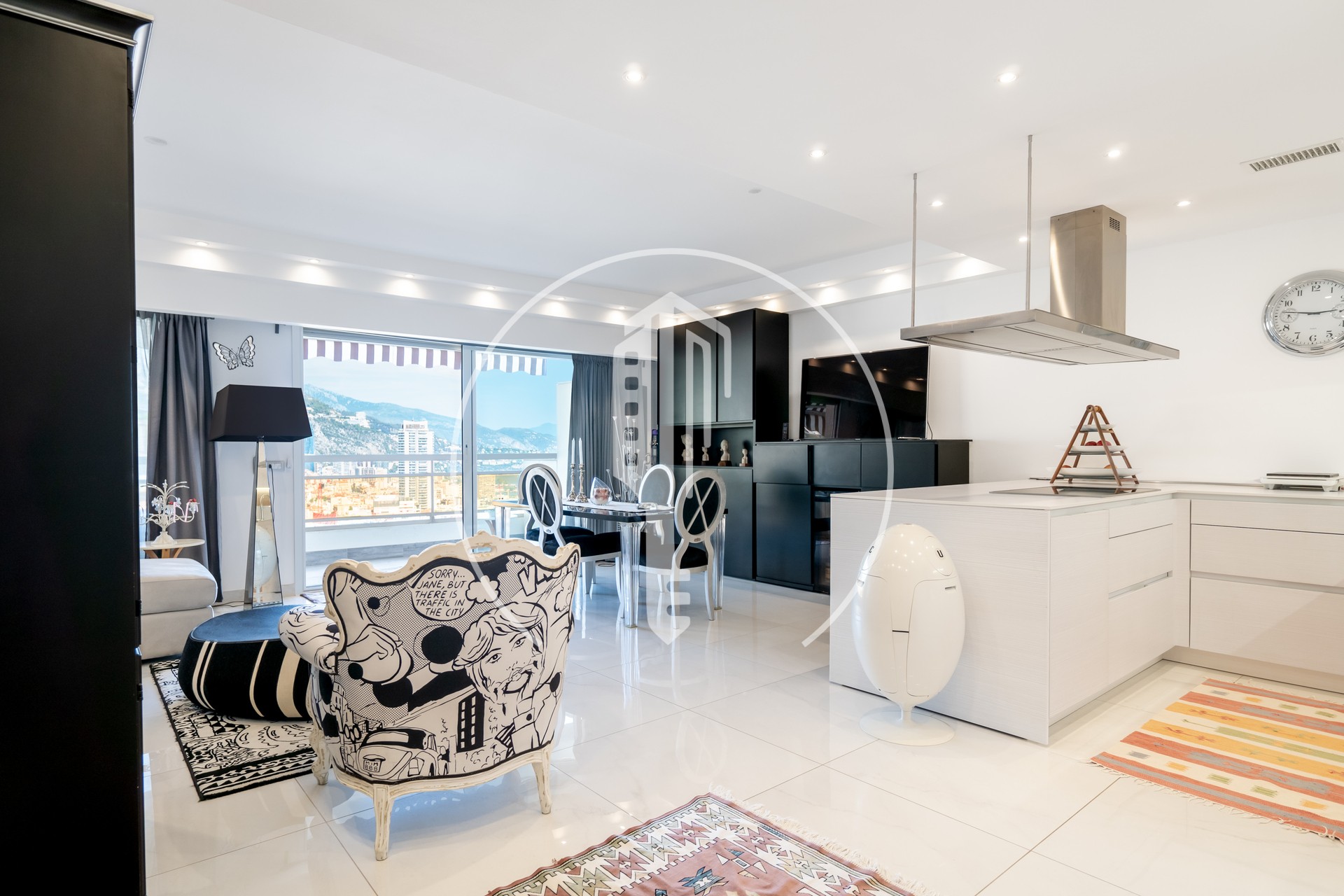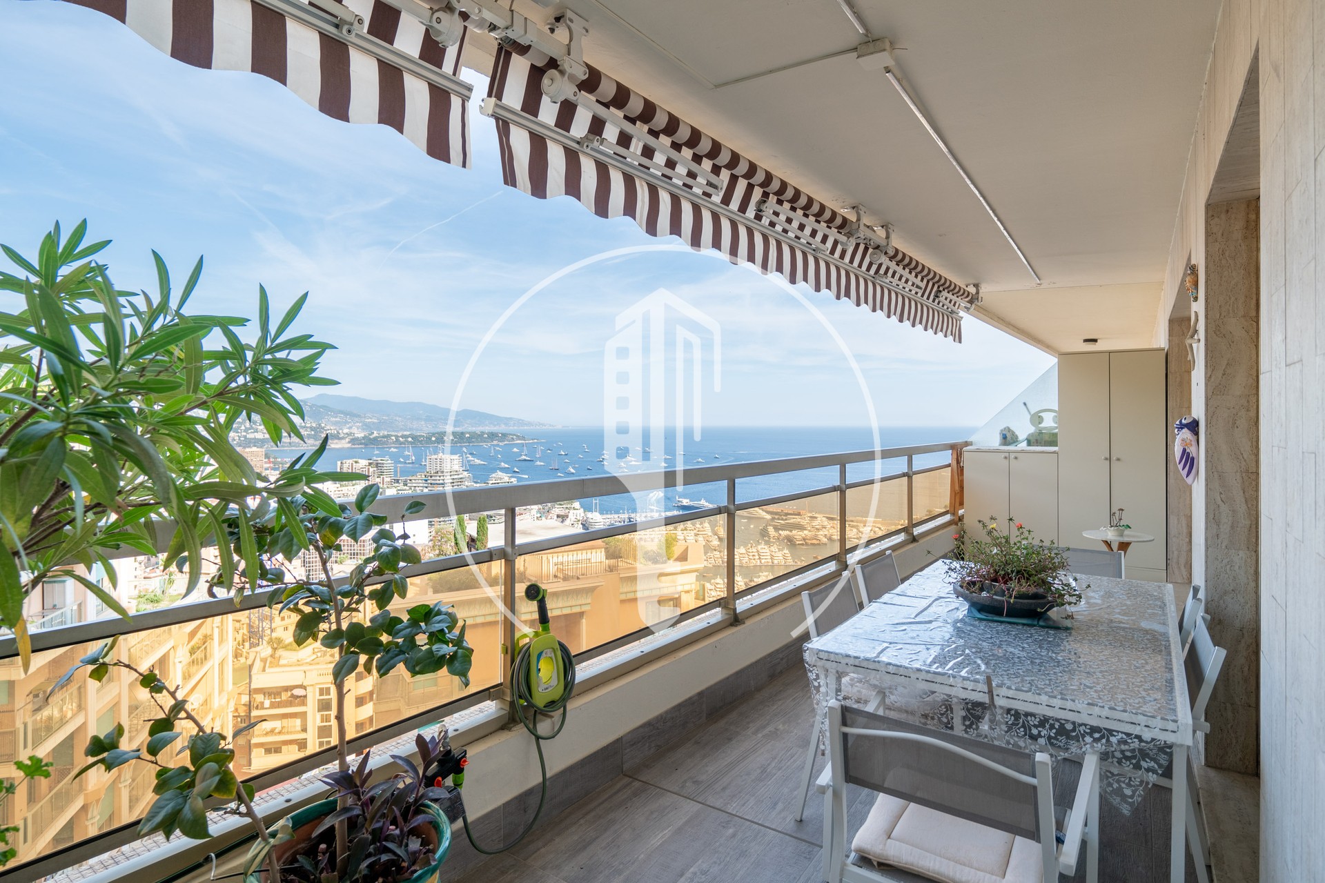 Con una superficie interna di 90,68 mq e una terrazza di 27,70 mq, situato a un piano alto, questo luminoso trilocale gode di una notevole vista panoramica sul mare e sul porto di Monaco.