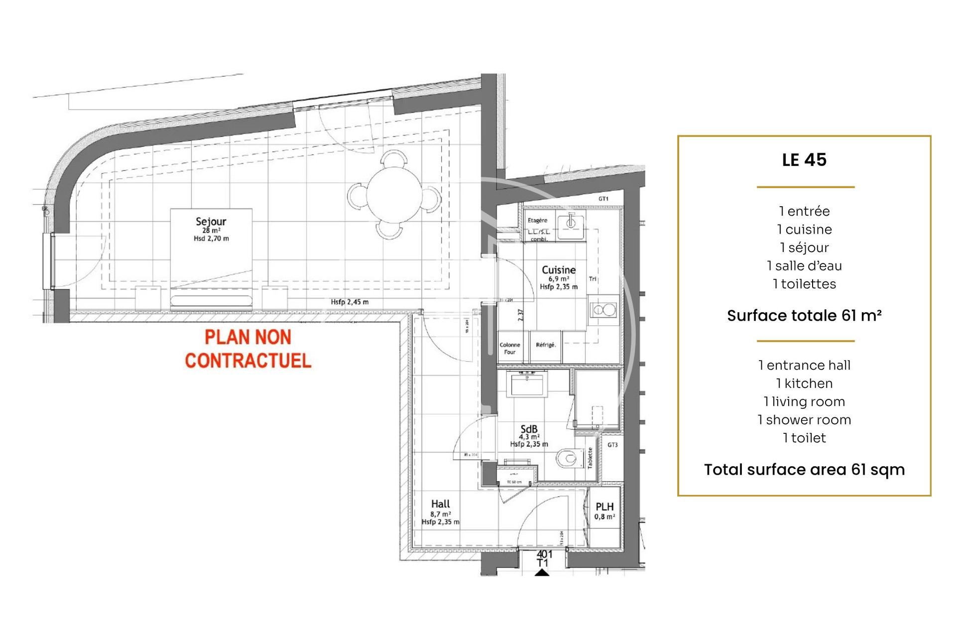 Superficie totale : 61.6 m²