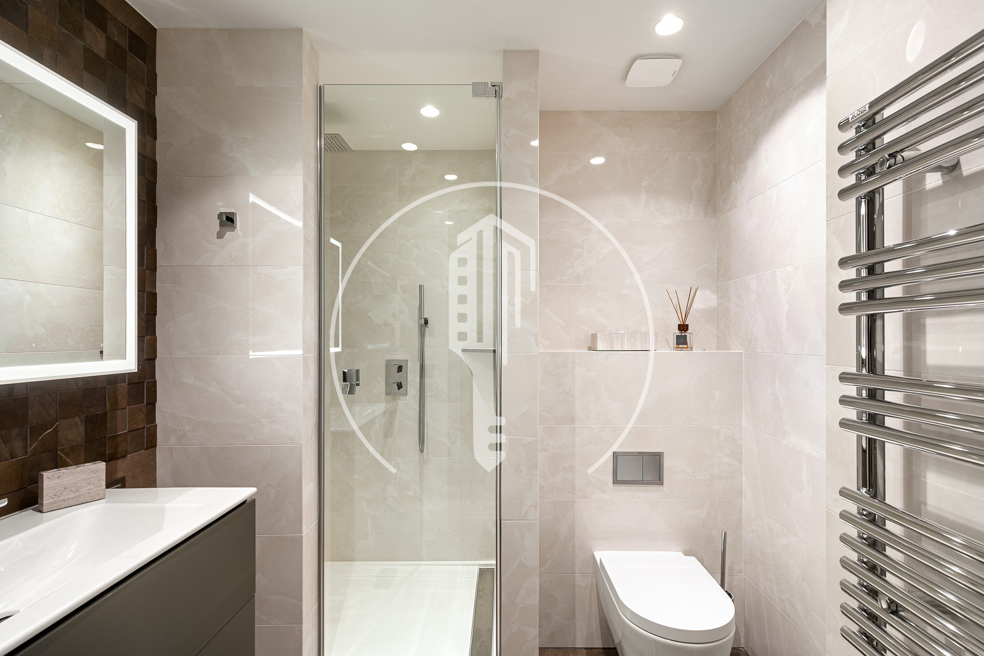 L'appartamento è composto da un ingresso con armadi a muro, da un elegante bagno dotato di doccia, WC, lavabo con mobile e specchio luminoso.