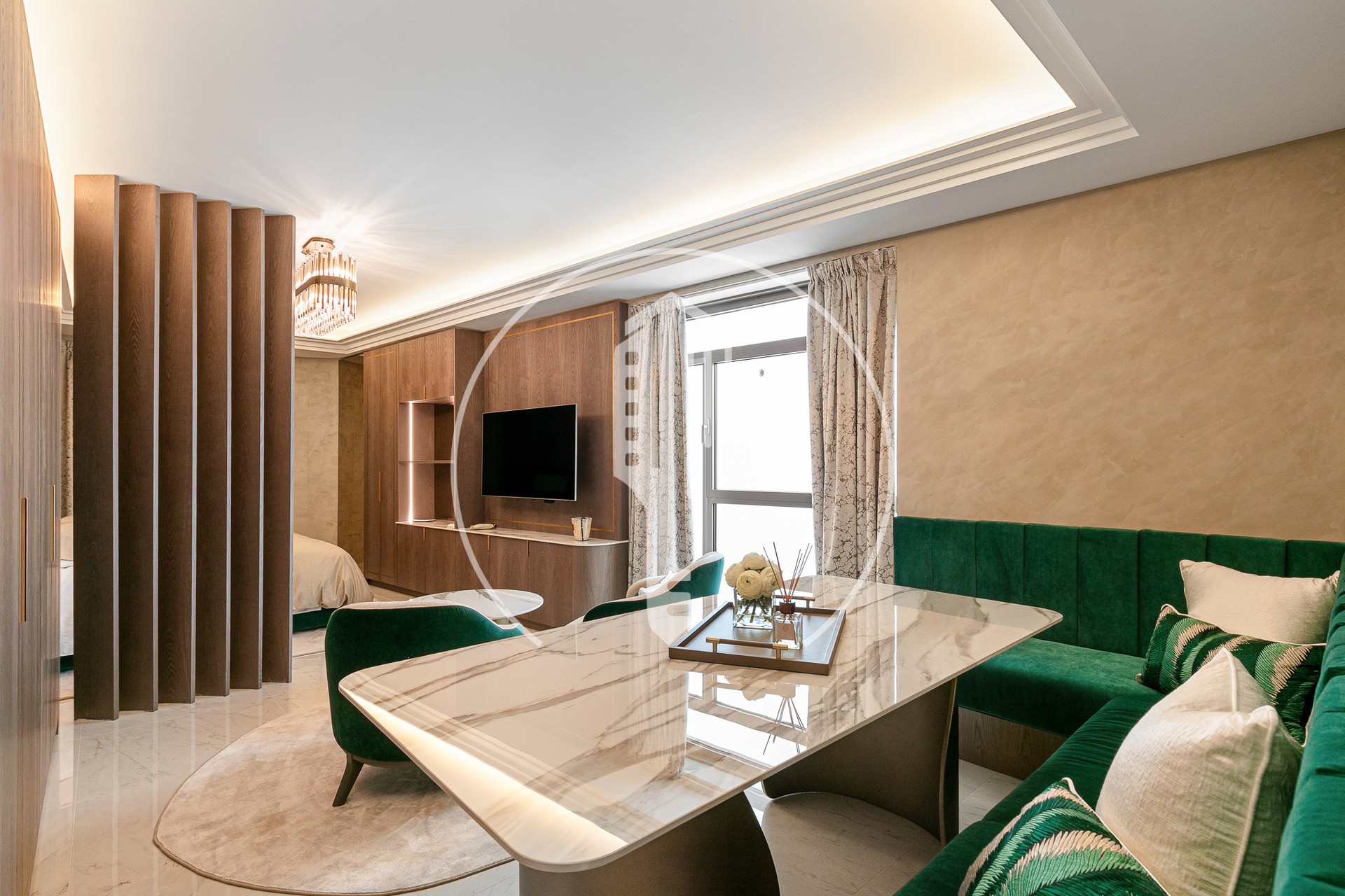 Un mobile TV a parete con armadi completa l'insieme, mentre le modanature rétroilluminate e un lampadario centrale sottolineano l'atmosfera dell'appartamento.