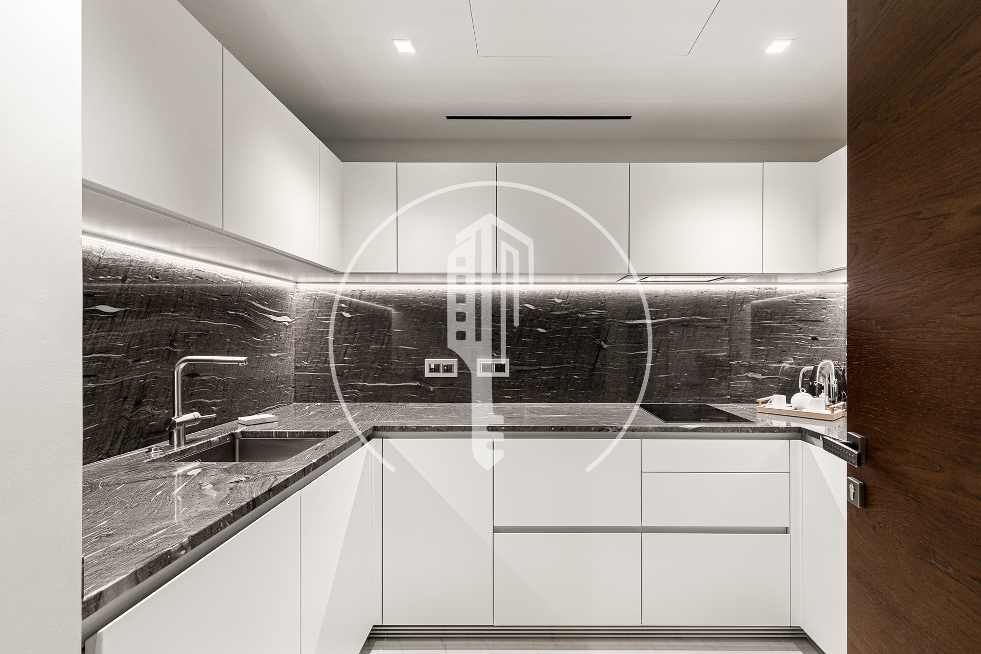 La cucina grande, completamente attrezzata con marca BULTHAUP, è separata; una disposizione rara per un monolocale.