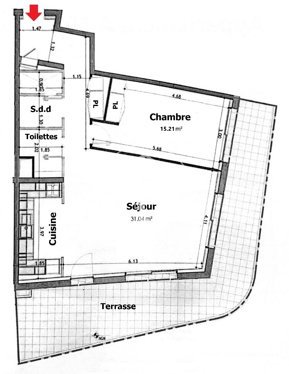 Une entrée, dégagement, spacieux salon, cuisine entièrement équipée, chambre avec placard, salle de douche, toilettes indépendant, terrasse, climatisation, double vitrage