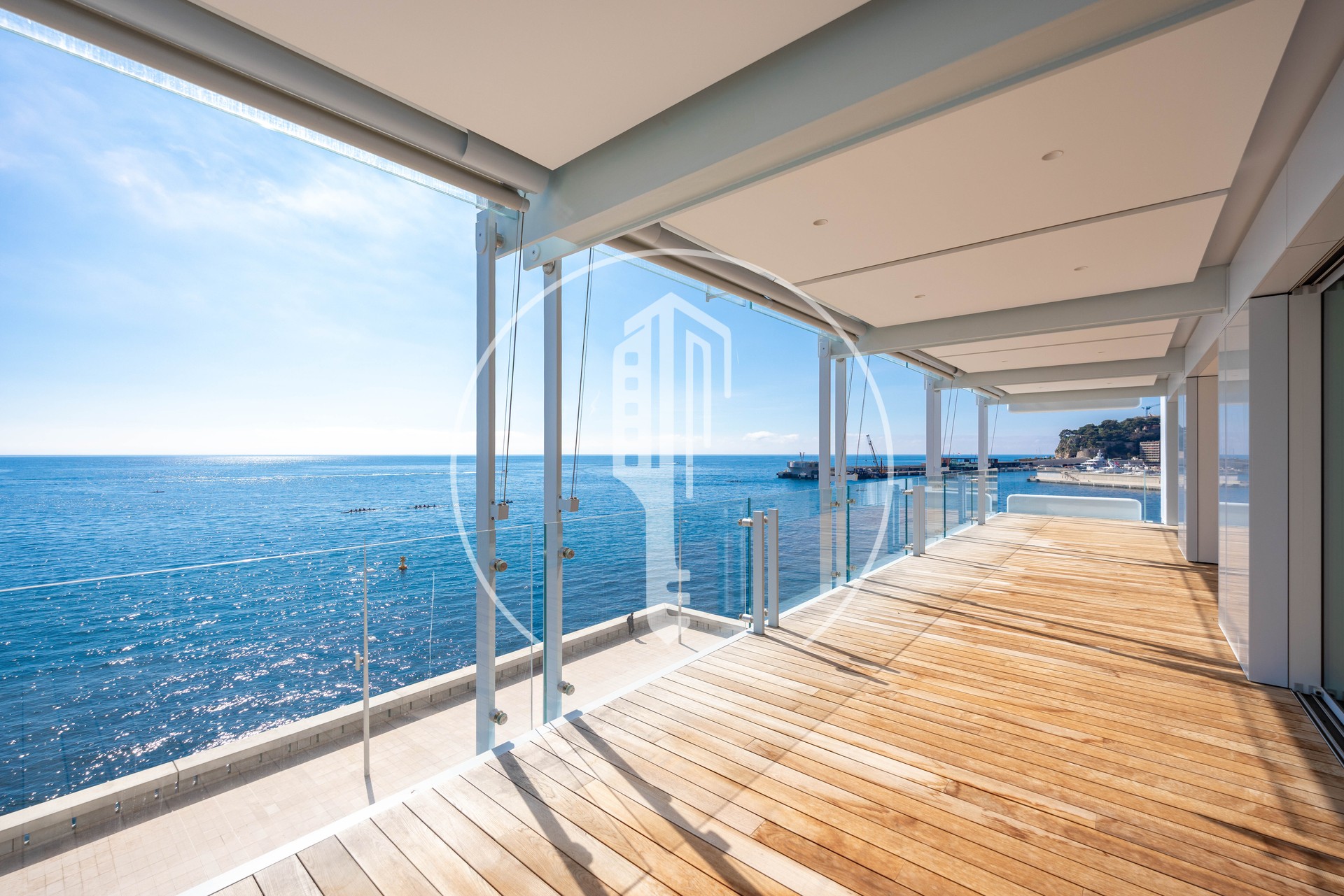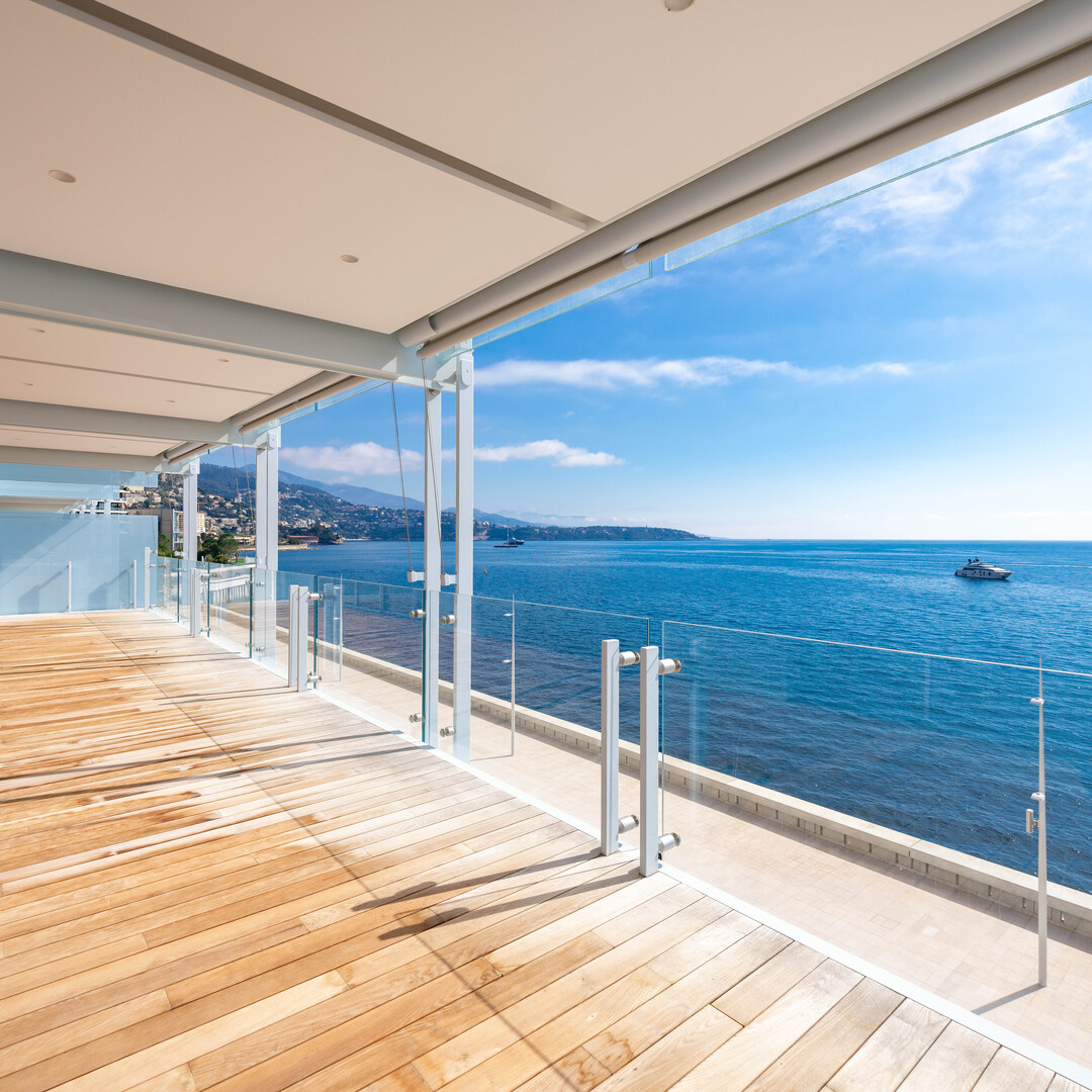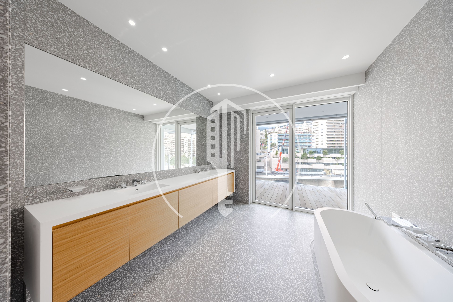 Appena entri, i volumi sono impressionanti. I 528 m² di interni offrono una spettacolare sensazione di apertura, estesi da 151 m² di terrazze sospese tra il cielo e il Mediterraneo. Lo sguardo si perde tra il blu profondo del mare e l'eleganza del porto di Monaco.